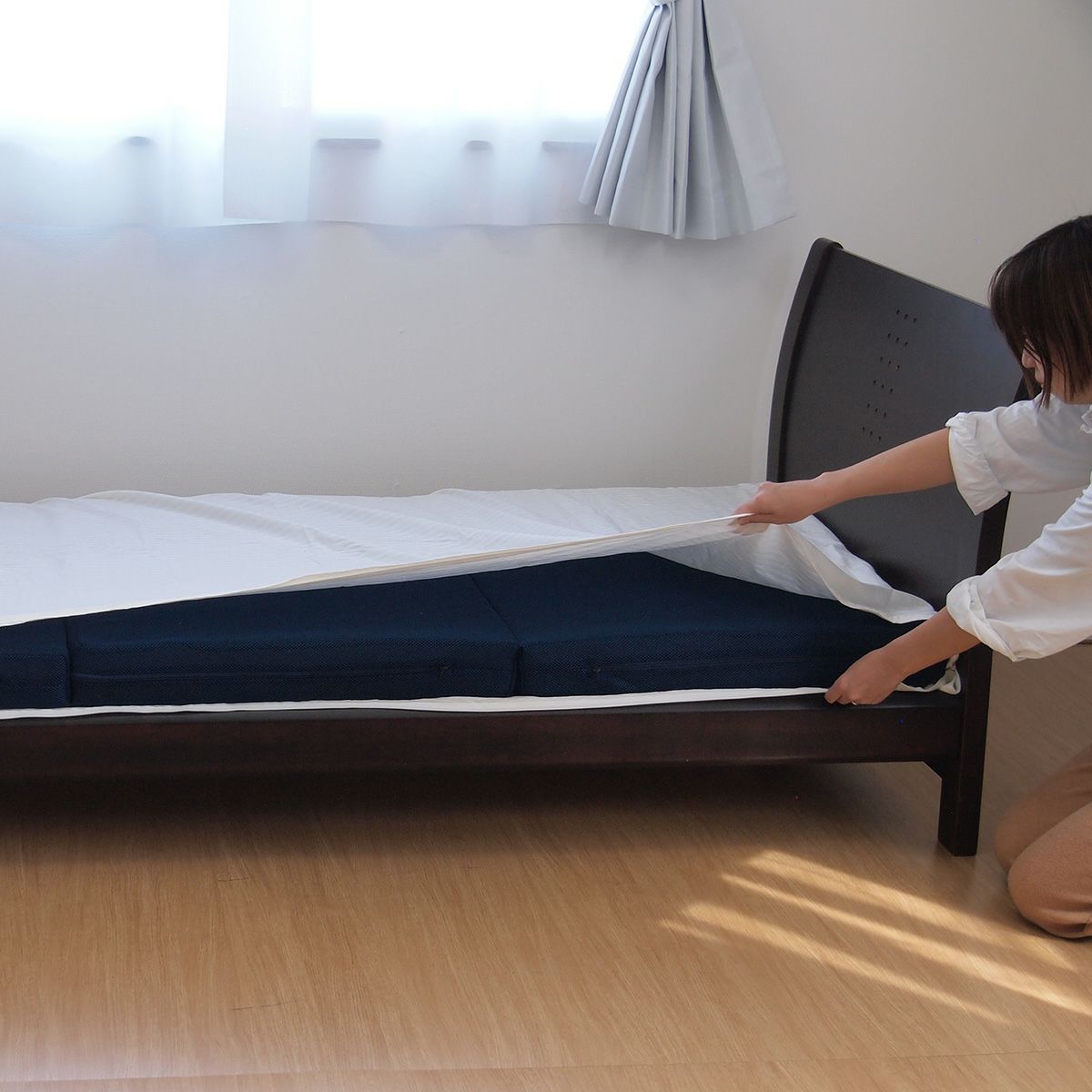 専用設計なので、サイズもぴったり。就寝中、シーツがぐちゃぐちゃに なって足にまとわりつくということもありません。 また、三つ折りが出来る敷布団ですが、専用綿シーツをつけたままでも 三つ折りしていただくことができます。