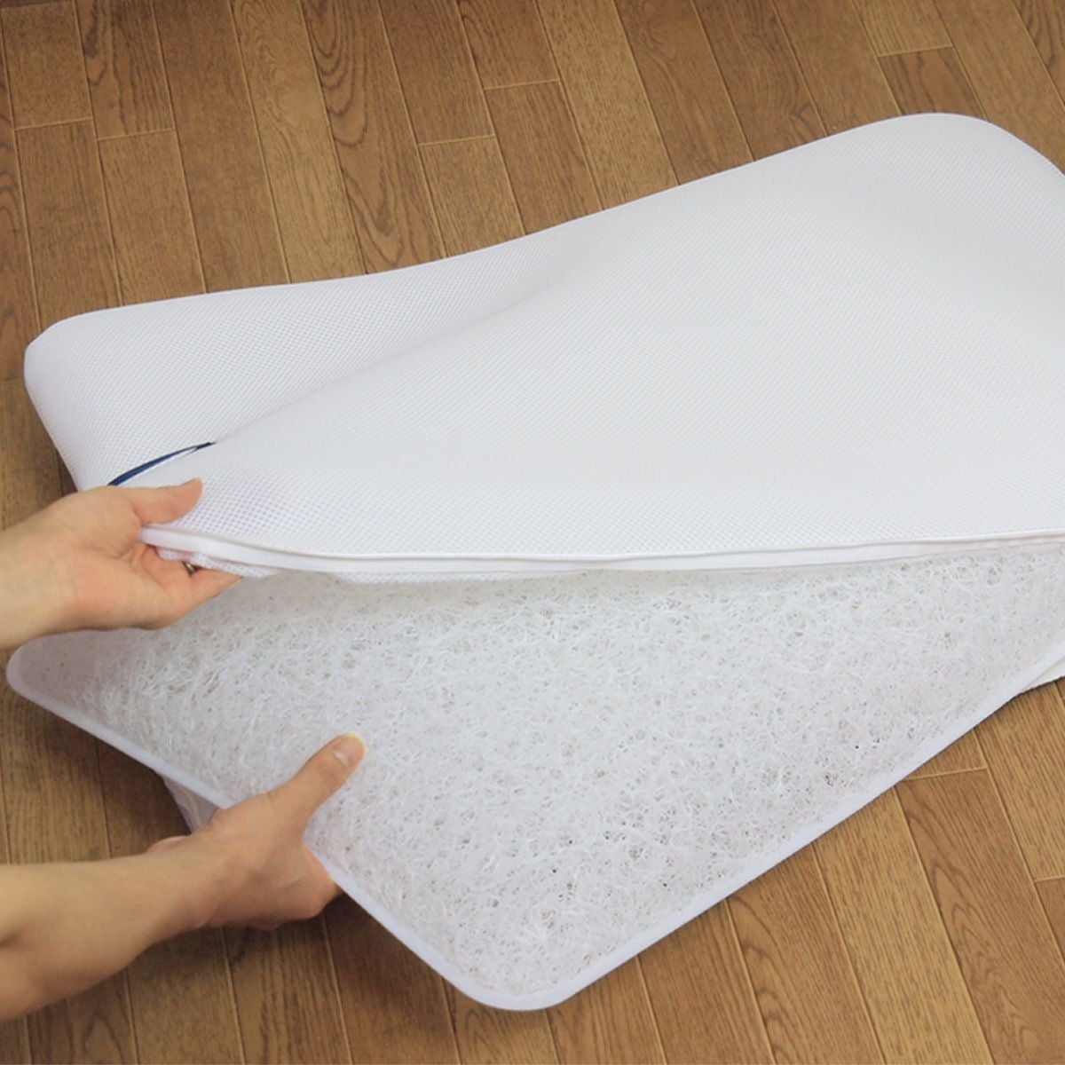 ネムリエまくらは、頭を優しく包み込みながらしっかりしたホールド感を創出できるよう、 柔らかめの上層としっかりめの下層となる多層構造を採用。